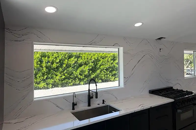 A full backsplash extends your granite or quartz slab from the countertop all the way to the ceiling, creating a seamless and elegant statement wall. Whether you choose natural granite or engineered quartz, this design highlights beautiful veining while eliminating grout lines for a clean, modern look. Granite offers unique, one-of-a-kind natural patterns, while quartz provides a durable, low-maintenance man-made surface with consistent color and design. Full slab backsplashes not only protect your walls but also transform your kitchen into a refined, high-end space.